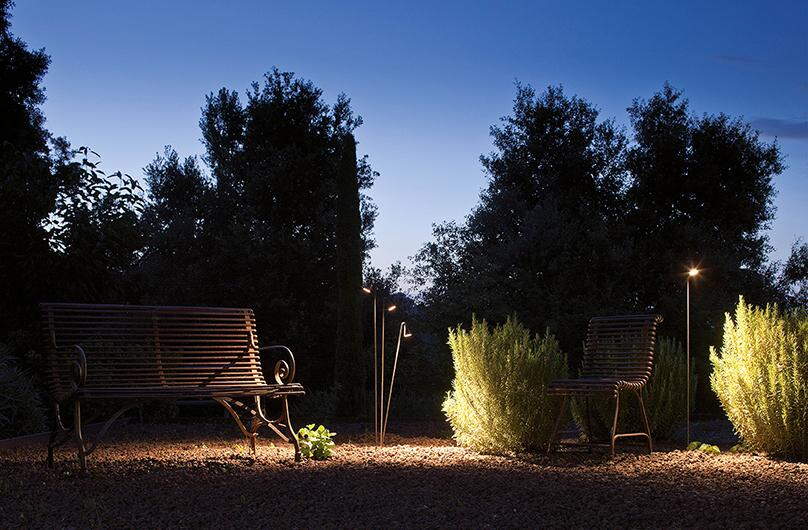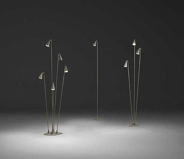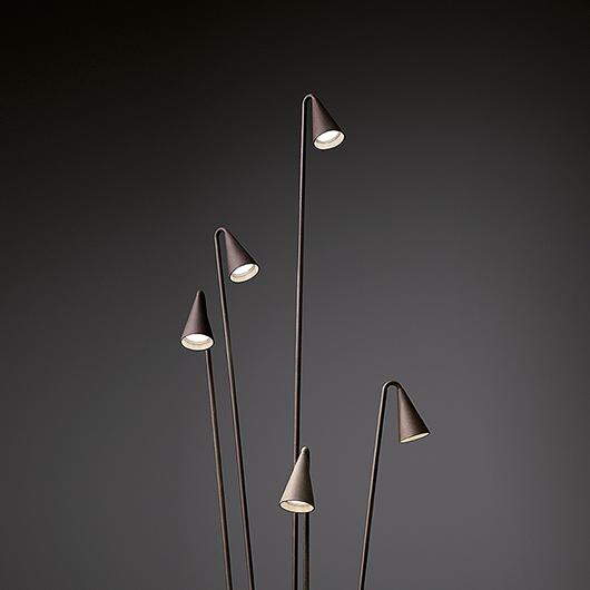 The design was inspired by the forest blue bell flower which adds to its easy integration within the garden environment and its accoutrements. The Brisa collection provides a focused beam of intense and warm light over exterior areas that require superior levels of illumination. Vibia equips the Brisa outdoor lamp with LED technology and offers the user a range of four floor lamp models available in surface mounted or built-in versions. The user can also choose between two finishes in natural tones: matt lacquered khaki or matt lacquered oxide (rust).