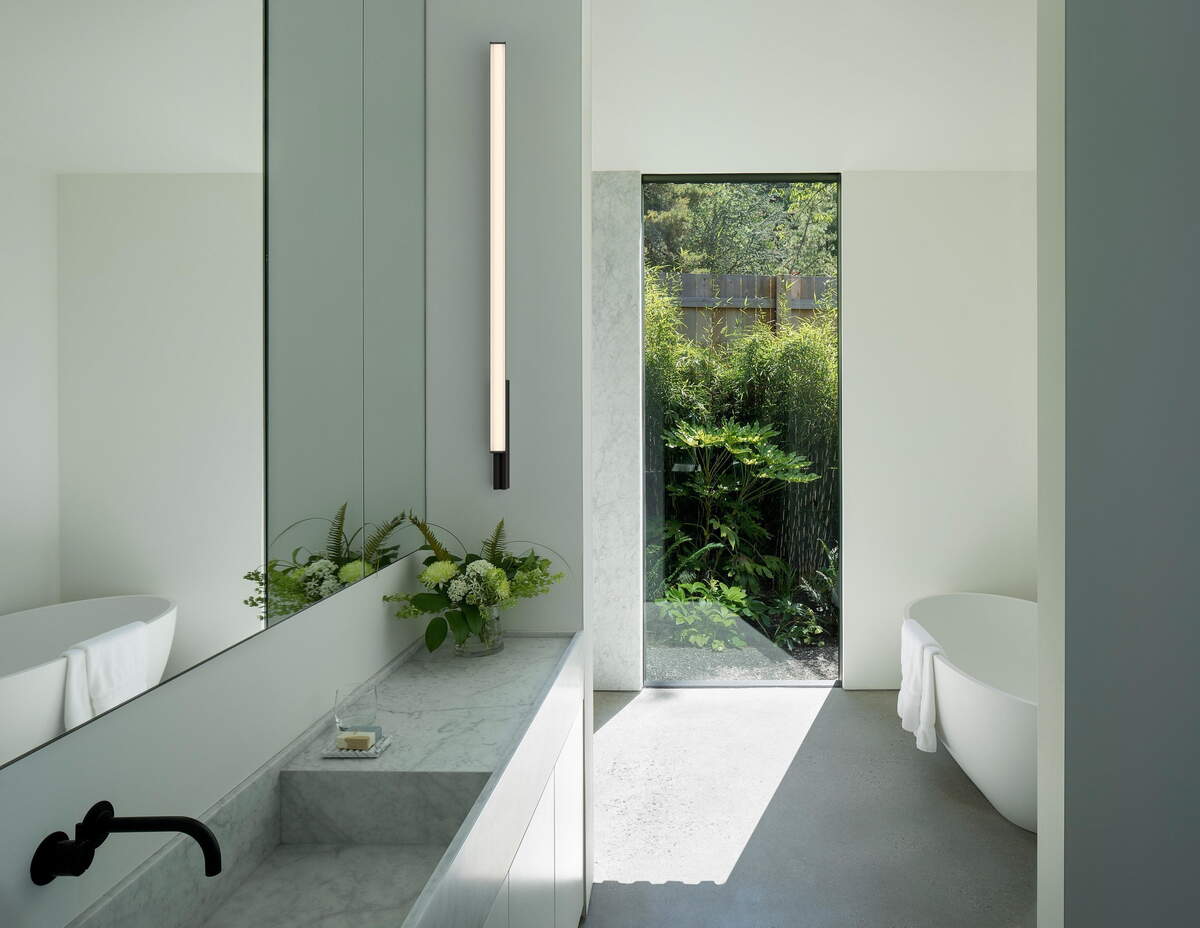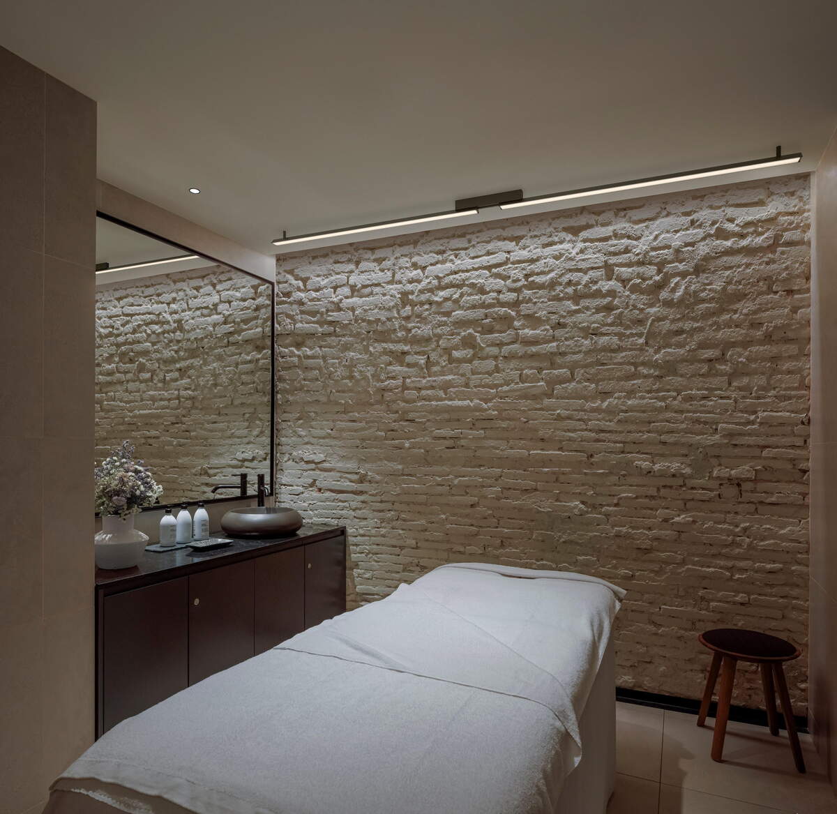 Minimalist and refined in form, the Spa wall lamp is an adaptable system of linear LEDs that allows for limitless compositional freedom to create a broad range of atmospheres, from intimate corners for personal wellbeing to functional spaces designed for general wellness. Particularly apt as a vanity light, the Spa wall lamp is positioned at an angle to send diffuse, ambiance light in the desired direction.
